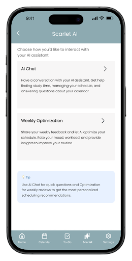 Our AI system helps you manage and optimize your time through a personalized End-of-Week (EOW) Report. This report analyzes both quantitative data (such as your Canvas grades) and qualitative data (your weekly reflections) for each class. Using this information, CalendR AI optimizes your schedule with smart recommendations across categories like class time, study sessions, office hours, intramural sports, gym time, and other daily activities.