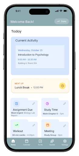 The prototype reflects a user-centered design process grounded in student interviews and task-flow analysis. Each feature was shaped around real pain points, such as juggling multiple apps, forgetting assignments, and struggling to plan effective study time. The result is a tool built for how students actually manage their day-to-day lives.