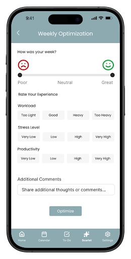 Or AI integration is a tool that helps you manage your time with an EOW (End of Week) Report. This report takes your quantitative data (your grades from canvas) and qualitative data (EOW Report) per class and optimizes you schedule accordingly. The slide bar at the top with your overall feeling, and your experience tracker (Workload, stress, and productivity) as well as any other comments left at the bottom are the qualitative data.
