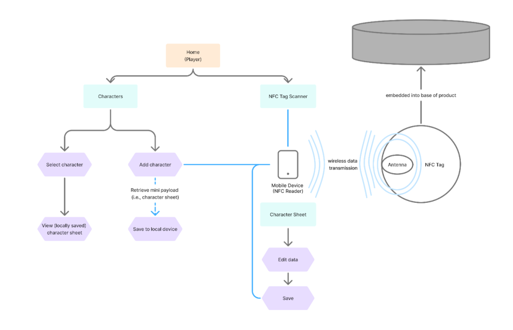 After an event (e.g., taking damage, earning gold), the user updates their sheet in-app and then taps the mini to overwrite data on the tag.
